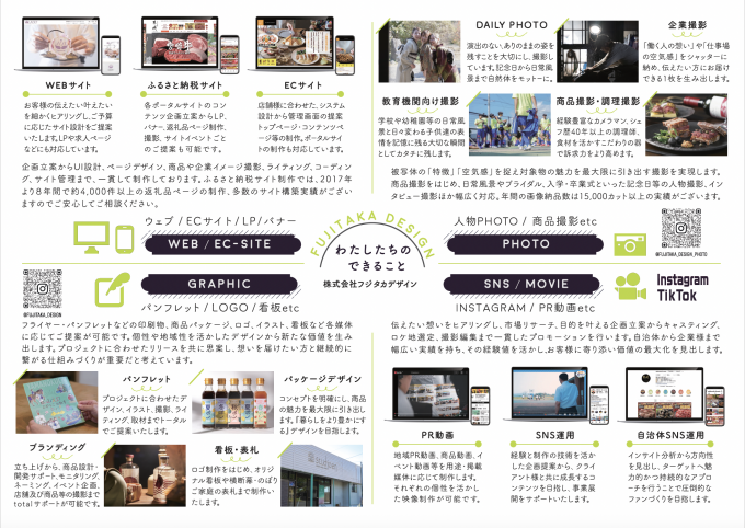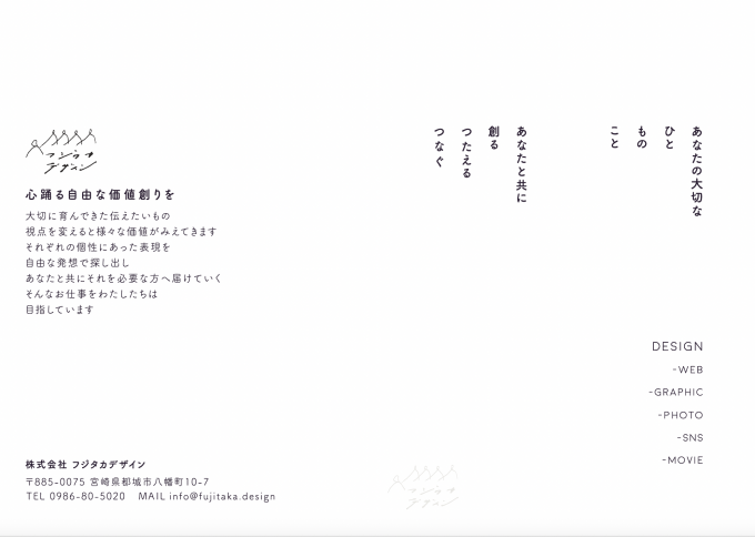 株式会社フジタカデザインは、宮崎県都城市を拠点に地域の想いや価値をブランディングし、デザインを通して発信しています。WEBデザインやグラフィック制作をはじめ、自治体様や企業様などの魅力を伝える表現全般を手掛け、日々さまざまなプロジェクトに挑戦し続けています。