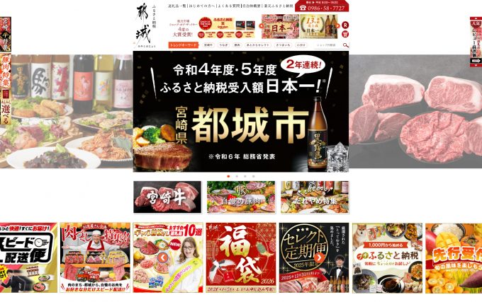 フジタカデザインは、都城市のふるさと納税返礼品に関わるクリエイティブ制作を包括的に手がけています。2017年から、楽天市場をはじめ主要なポータルサイトに掲載される返礼品のバナーデザインや特集ページ企画を一手に担当。返礼品数は1500点以上にのぼり、リサイズなどの作業を含めると膨大な制作点数を手掛けています。
