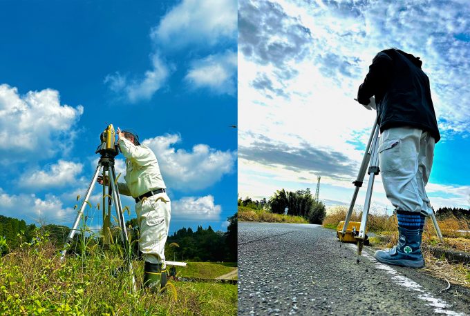 「測量」 土地の形や高さを正確に測る作業です。道路や橋、建物に線路など、全ては測量から始まり ます。現在はデジタル化が進み、据え置き型の測量機器、ドローンやハンディスキャナーな ど、多様な機器が活躍しています。